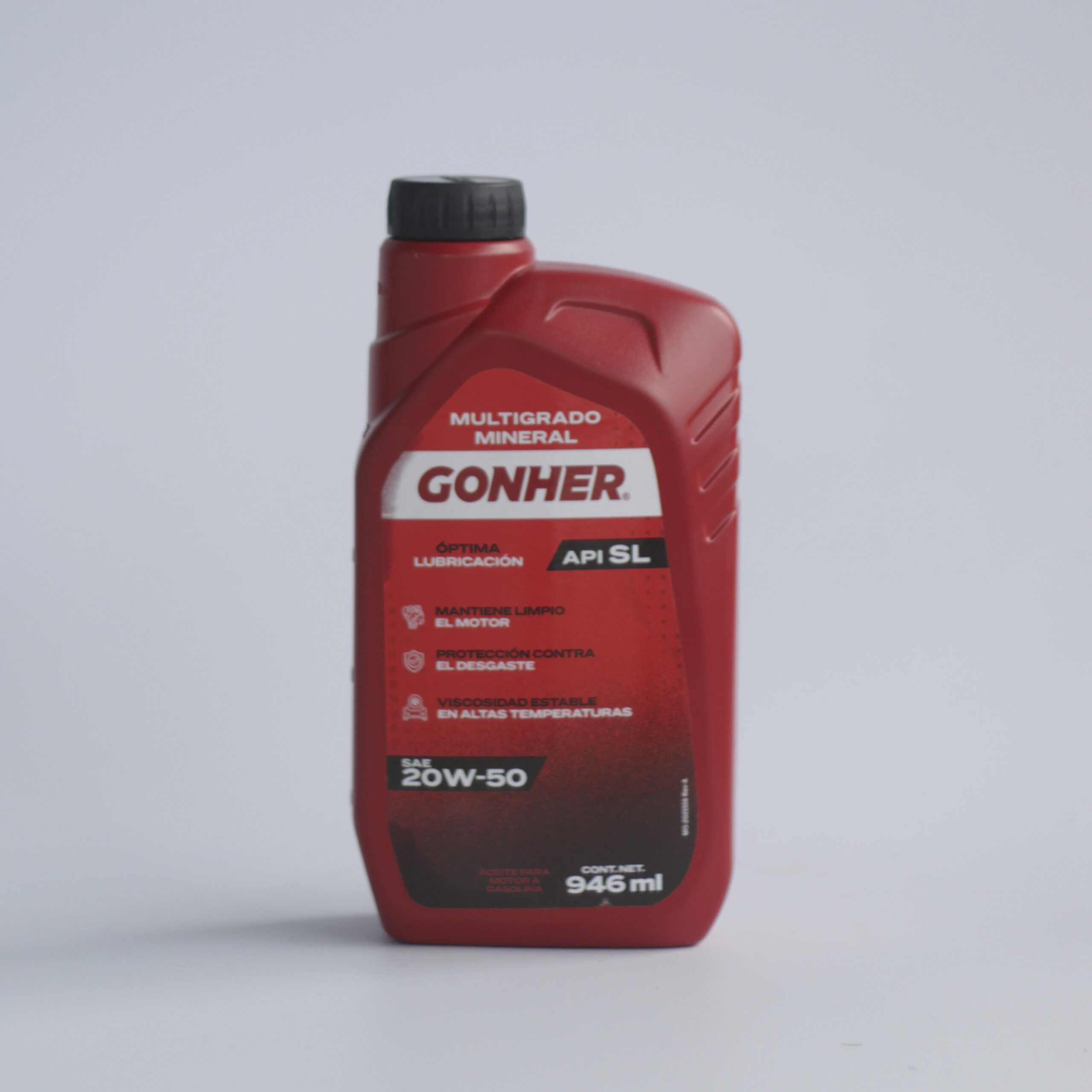 GONHER multigrado mineral API SL SAE 20W-50 en presentaciones de 946 ml y 5 L. Óptima lubricación, limpieza interna y protección antidesgaste. Factura electrónica con IVA incluido y descuentos por volumen.