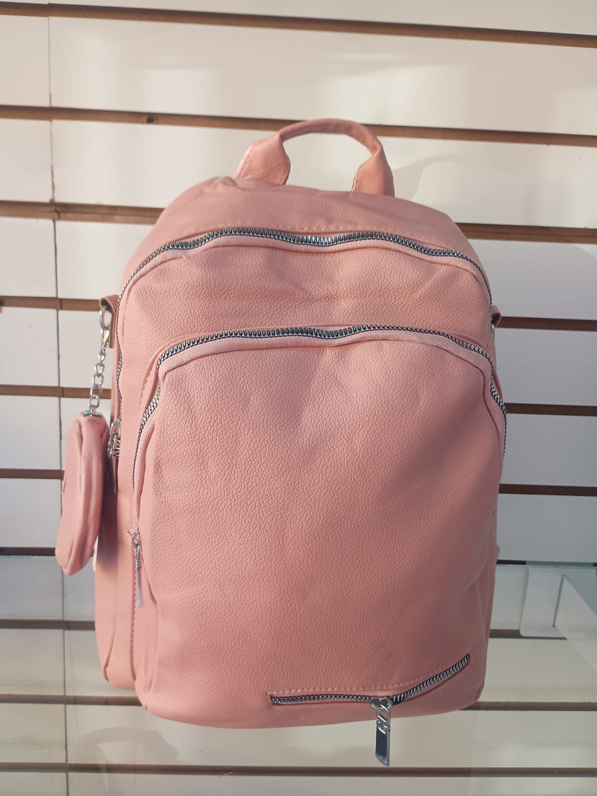 Esta mochila de diseño moderno y funcional es el accesorio perfecto para el día a día. Confeccionada en un material resistente de alta calidad con textura, su color rosa pastel le da un toque de sofisticación y versatilidad. Cuenta con varios compartimentos con cierre de cremallera metálica para mantener tus pertenencias organizadas y seguras. El compartimento principal ofrece amplio espacio para tus esenciales, mientras que los bolsillos frontales y laterales son ideales para objetos de acceso rápido. Además, incluye un pequeño monedero a juego, unido por una elegante cadena, perfecto para monedas o llaves. Sus correas ajustables y el asa superior garantizan comodidad y practicidad en todo momento.
